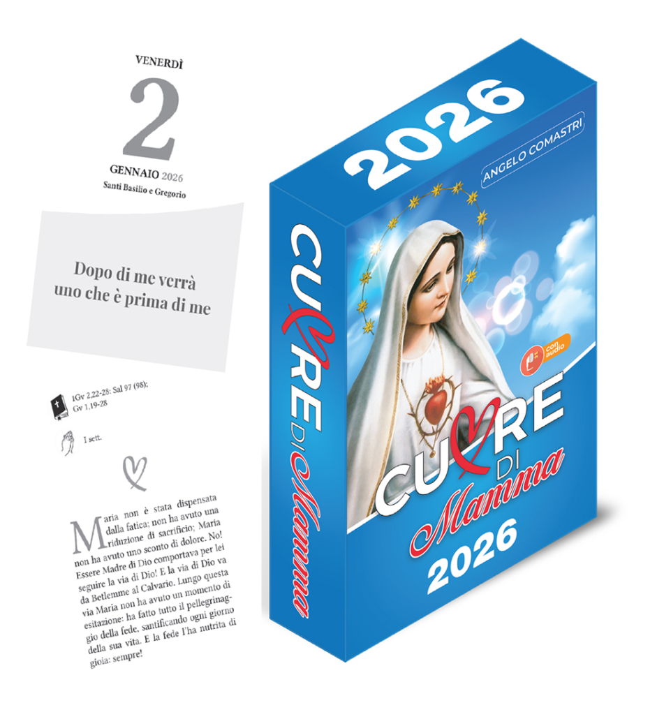 Un calendario costituito da 365 fogli da staccare di giorno in giorno, come si faceva una volta. Nel davanti del foglio è riportata in evidenza la data, il Santo o la ricorrenza liturgica, e una breve frase tratta dal Vangelo del giorno; nel retro, i riferimenti biblici della Liturgia del giorno e la settimana del Salterio della Liturgia delle Ore, e un pensiero mariano del card. Comastri. Uno strumento unico per farci accompagnare nel 2026 come figli da Maria, la Donna che dicendo “sì” ha spalancato le porte della storia umana a Dio, e ora continua la sua opera accanto al Figlio portandoci nel suo cuore di madre.